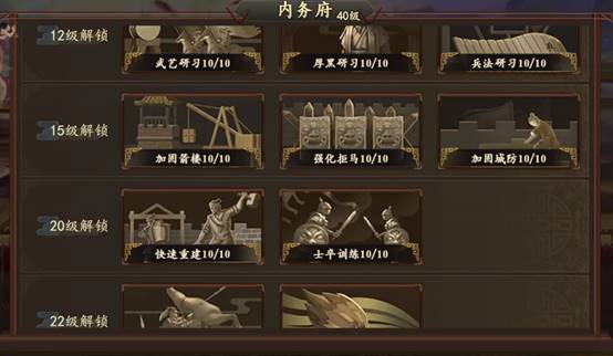 1. 内务科技:内务科技有资源产出相关科技,有战斗力相关科技,只讨论战斗力相关。5级解锁的攻击力阵型和瞄准射击,一般优先研究瞄准射击,因为一般输出来源于后排,如果玩家阵容前排战斗力较高除外。7级解锁的防御阵型和短兵相接,优先研究防御阵型,短兵相接给后排增加防御,作用不大。12级解锁的武艺研习,厚黑研习,兵法研习,分别百分比增加武力,智力,统率,玩家需要根据自身阵容选择优先研究。22级解锁英勇和诡道,玩家可在战斗后的统计里看自己阵容的伤害构成,普通伤害多则优先研究英勇,计策伤害多则优先研究诡道。25级解锁坚毅和洞察,玩家可以在战斗后统计里看对手的伤害构成,对手普通伤害多则优先研究坚毅,对手计策伤害多则优先研究洞察。30级解锁提升暴击和提升韧性,两个属性性价比比较接近。容易忽略的是武将派遣,给内务府派遣高政治武将可大幅减少研究时间。