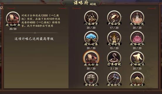 1. 谋略府科技:谋略府应选择适合阵容的谋略,每个阵容可带两个谋略。前期阵容强度不够,可使用高固定数值的谋略,如趁火打劫。后期依赖技能的阵容可使用远交近攻提高技能释放频率,后期需要生存的阵容可带金蝉脱壳提供6秒大幅度减伤。容易忽略的是武将派遣,给谋略府派遣高政治武将可大幅减少研究时间。