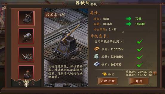 1. 器械研究:前期可使用投石机和弩车打固定输出,后期阵容起来之后建议把弩车和投石机替换为战鼓(尤其是弩车),弩车在后期输出占比不高并且容易给对手武将叠怒气。给器械所派遣武将可减少研究时间。