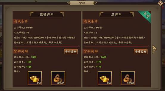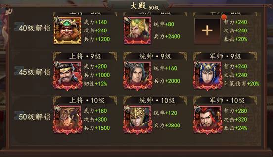 大殿官职跟大殿等级相关,每升五级解锁3个官职,前两个是前排坦克武将官职,后一个是后排输出武将的官职,建议玩家把主力阵容给最高等级的官职,可大幅提升阵容强度。