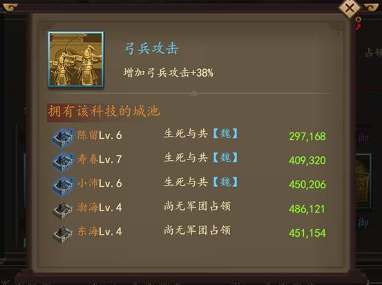 加入占领陈留,寿春,小沛城池的军团可百分比增加弓兵攻击,对阵容提升较大,其他的如盾兵防御,枪兵防御,骑兵防御......这些BUFF也能增加阵容强度,新手玩家应优先选择占领城池多的军团加入以获取增益BUFF。