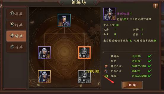 1.兵种升级:前期仅能升级初始兵种,需要消耗信物和精锐之证。材料主要打野产出。在初始兵种20级后可解锁升级二阶兵种,二阶兵种20级后解锁升级三阶兵种。建议材料优先升级弓兵,弓兵适用的武将较多,性价比高